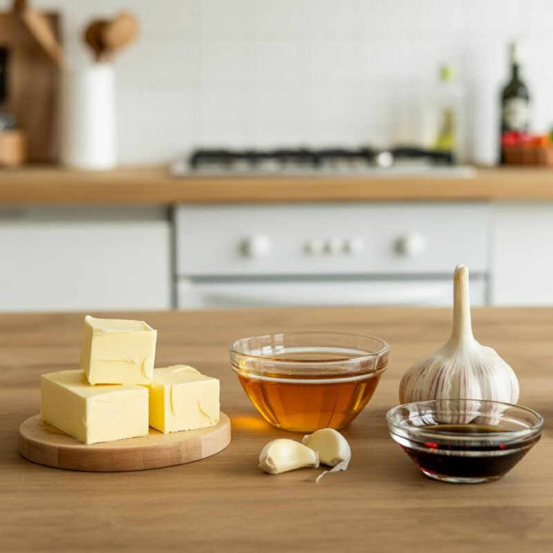 - Make the glaze. Melt butter; stir in honey, minced garlic, and optional soy sauce. Simmer gently 30–60 seconds to tame the raw garlic edge.