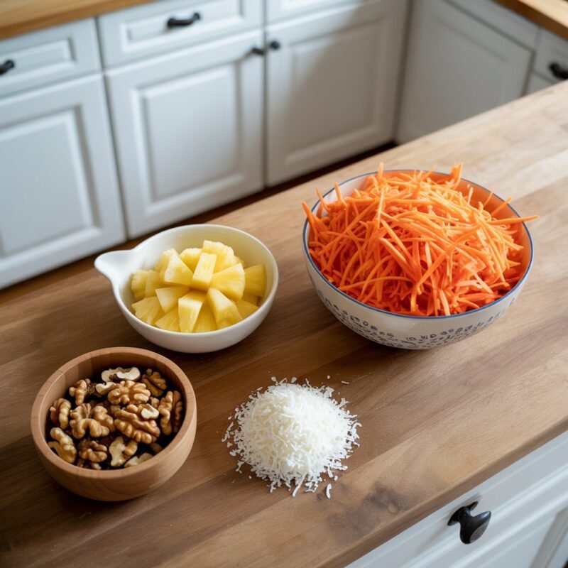 - Combine and Add Mix-ins: Stir dry ingredients into wet. Fold in carrots, drained pineapple, nuts, and coconut.