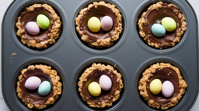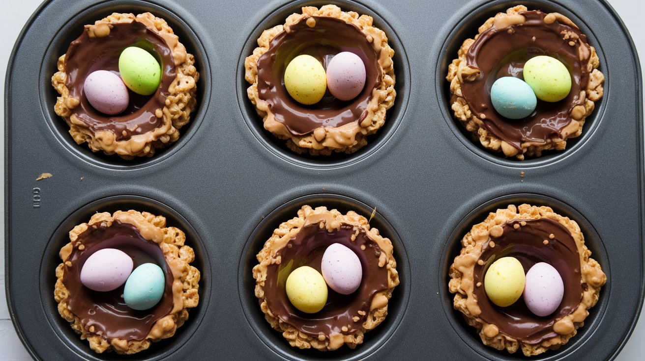 Once the nests are firm, remove them from the tin. Place three Cadbury Mini Eggs in the center of each nest. And that’s it—your edible nests are ready to serve!