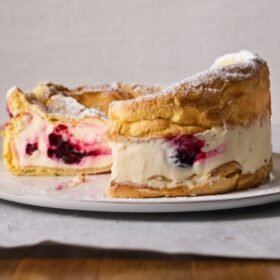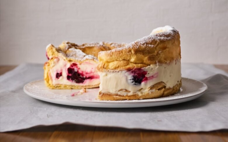 - Assemble: Place one choux round mountain-side up. Spread the cherry compote, then the mousseline in an even layer. Cap with the second choux round. Chill at least 3 hours to set.