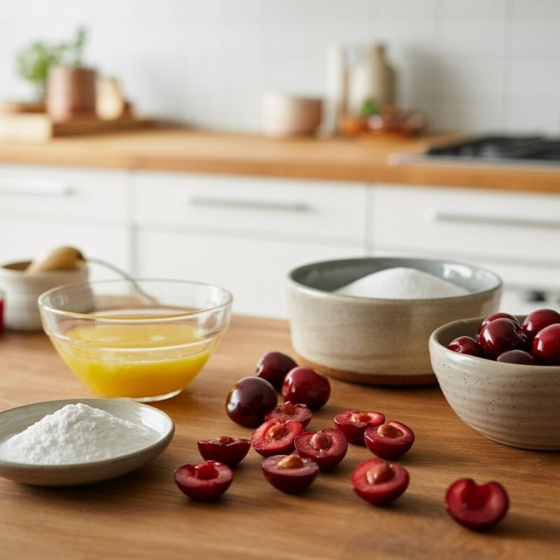 - Make the cherry compote: In a small saucepan, cook cherries, sugar, and lemon juice over medium heat until juicy. Stir in cornstarch slurry; simmer 1–2 minutes until thick and glossy. Cool completely.