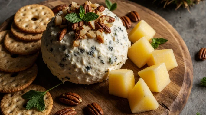 cups of chopped pecans on a plate or a shallow dish. Unwrap the chilled cheese ball and gently roll it in the pecans, pressing lightly to ensure the entire surface is generously coated. - Present: Transfer the finished cheese ball to a serving platter. Arrange your choice of crackers, sliced fruits, and fresh vegetables around it.