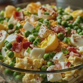 - Step 4: Combine Everything – In a large bowl, add peas, chopped eggs, bacon or ham, green onions, and cheese. Pour in dressing and gently fold to coat without mashing peas.
