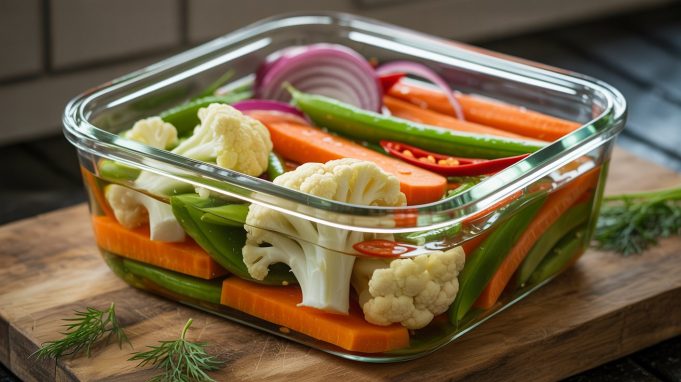 Place your prepared vegetables in a large bowl or directly into mason jars. Carefully pour the hot brine over the vegetables, making sure everything is fully submerged. Let the mixture cool to room temperature.