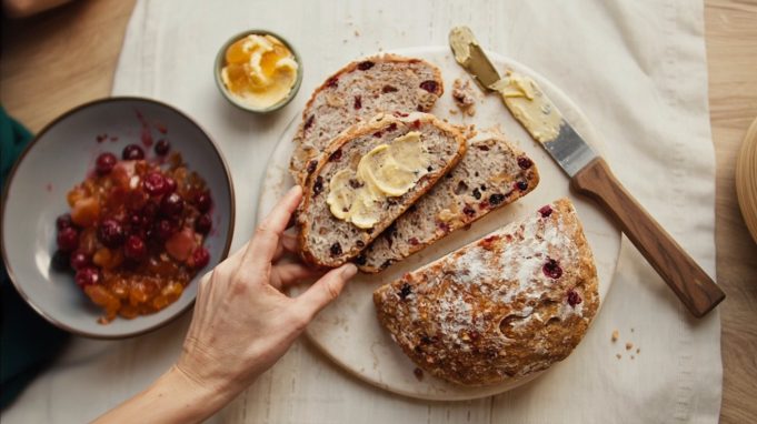 For dinner, pair with hearty soups and stews – the cranberries complement butternut squash soup beautifully. Create memorable sandwiches with turkey, brie, and arugula. During holidays, cube day-old bread for exceptional stuffing with sage and celery. The festive cranberries and nuts make this ideal for Thanksgiving tables or Christmas morning, wrapped in a kitchen towel as a thoughtful homemade gift.
