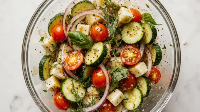 Drizzle the vinaigrette over the cucumber mixture and toss gently to coat everything evenly. Let the salad sit for about 10 minutes before serving to allow the flavors to meld.
