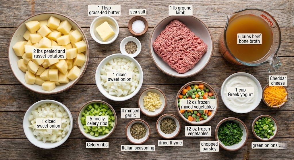 To build this deconstructed shepherd’s pie soup, we rely on whole, nutrient-dense ingredients. The quality of your broth and meat will dictate the depth of flavor.
