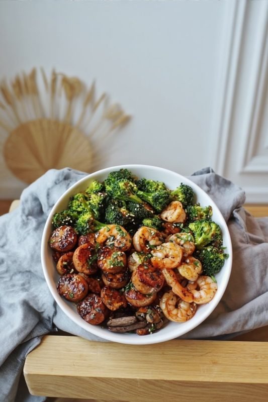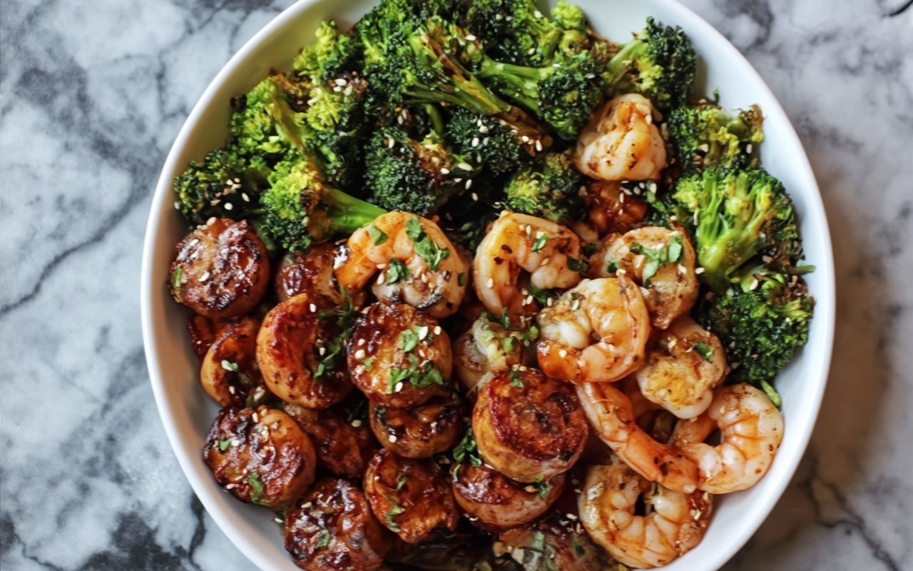 - Cook: ~15–18 minutes (sear sausage, char-steam broccoli, quick-cook shrimp, glaze)