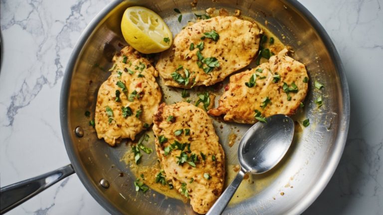 - Air-fryer option: Skip flour. Spray breasts, season, air-fry at 380°F (193°C) for 14–18 minutes, flipping once; finish with melted butter, garlic, and lemon.