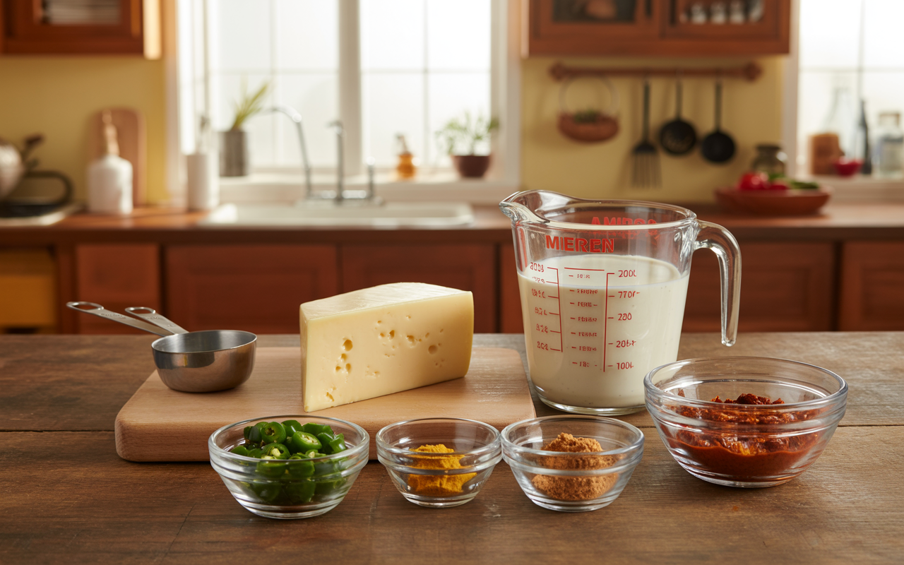 Below is everything you need to make a silky, restaurant-style Mexican white queso dip. Each ingredient plays a specific role in flavor, texture, or aroma.