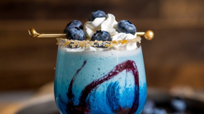 Top with a generous swirl of whipped cream and a few sugared or fresh blueberries. Serve immediately with a straw and a tropical attitude.