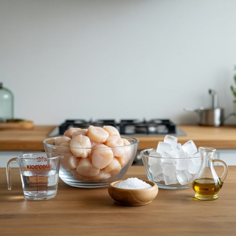 • Prepare the Brine: Whisk kosher salt and hot water until dissolved. Add ice cubes to cool. Submerge scallops in the cold brine for 10 minutes.