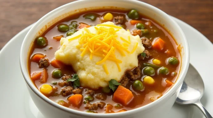 This dish is especially great for busy families, cozy dinners for two, or anyone looking for a way to use up leftover mashed potatoes in a fun and creative way. It’s a one-pot wonder that combines the meaty, veggie-filled base of shepherd’s pie with the cozy warmth of a creamy soup — all topped with buttery mashed potatoes and gooey melted cheddar cheese.