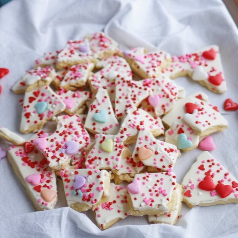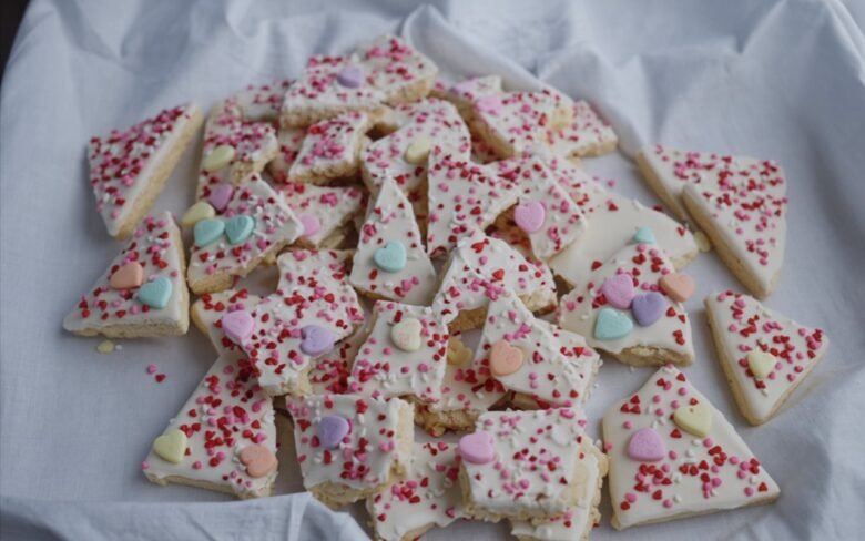 - Making It Pretty: Immediately scatter conversation hearts and sprinkles all over the top. Press gently so they stick. Let cool completely, then chop into jagged pieces.