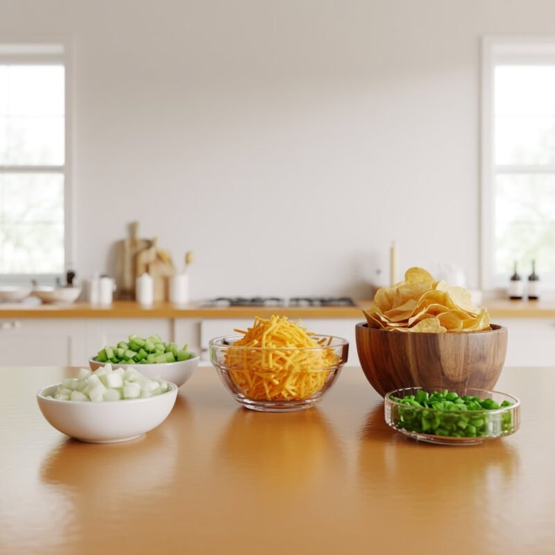 Pour the mixture into your prepared baking dish, spreading it out in an even layer. Sprinkle the remaining 1/2 cup of cheddar cheese evenly across the top, followed by the crushed potato chips or bread crumbs. Bake uncovered for 20 to 25 minutes, or until the edges are bubbling and the topping is golden brown. Let it rest for 5 minutes, garnish with chopped green onions, and serve hot!