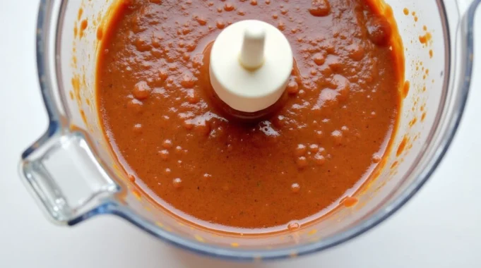 Remove the sauce from heat and carefully transfer it to a blender or food processor. Puree until the mixture is silky smooth and thickened. You can add a tablespoon of water at a time if it’s too thick for your liking.