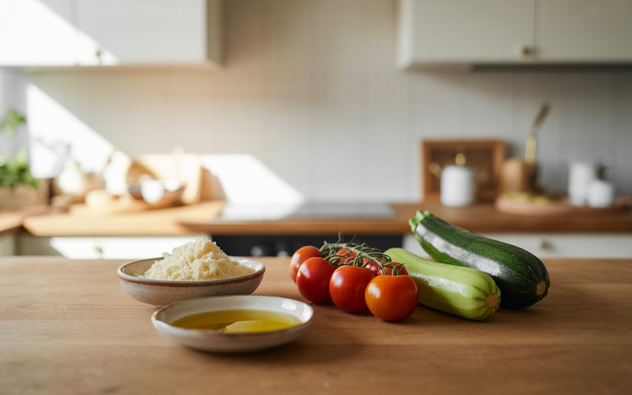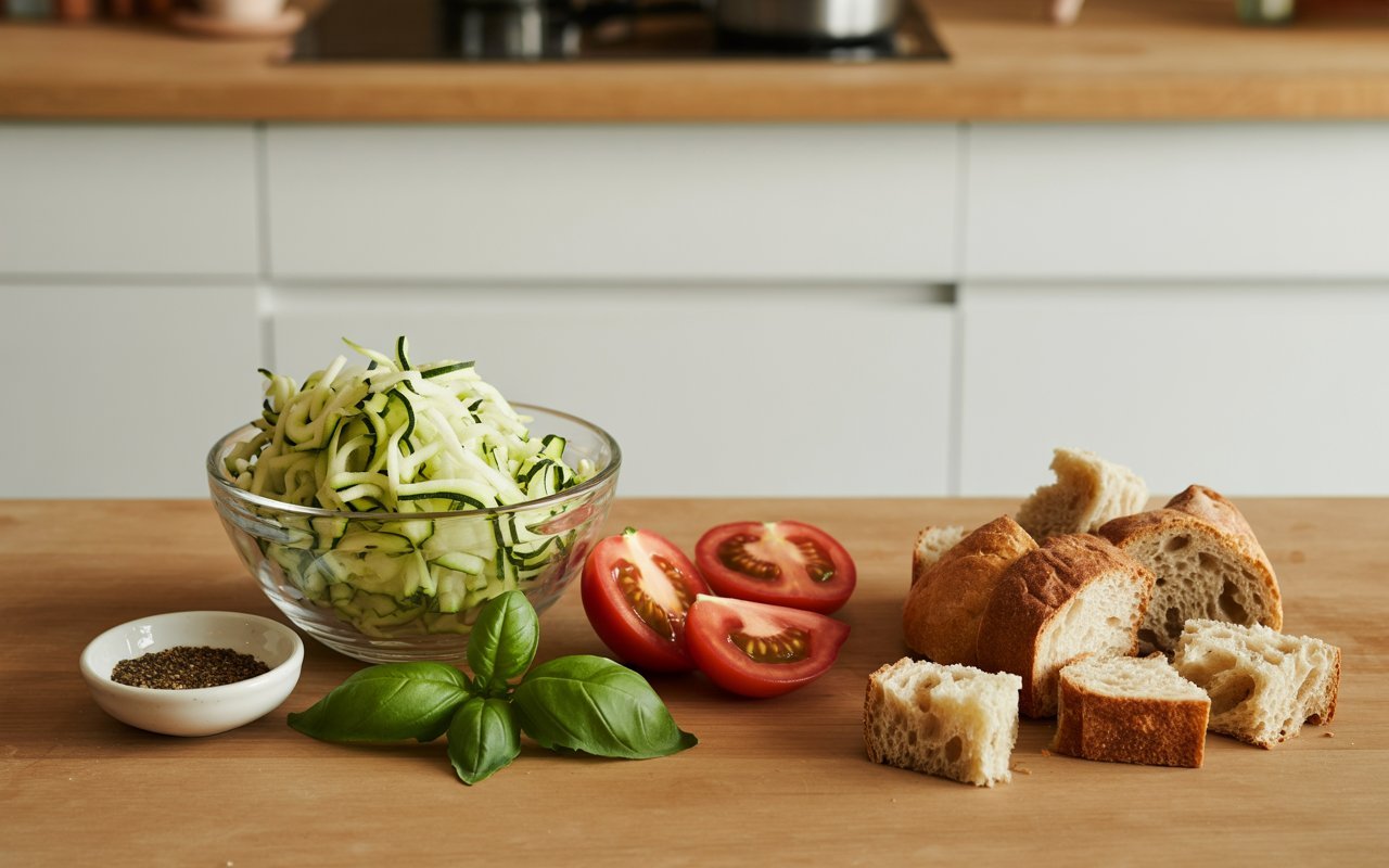 - Prep Veg & Bread: Preheat oven to 350°F (175°C). Grate zucchini and squeeze out moisture. Chop tomatoes and drain. Cube day-old bread, lightly moisten, then squeeze dry.