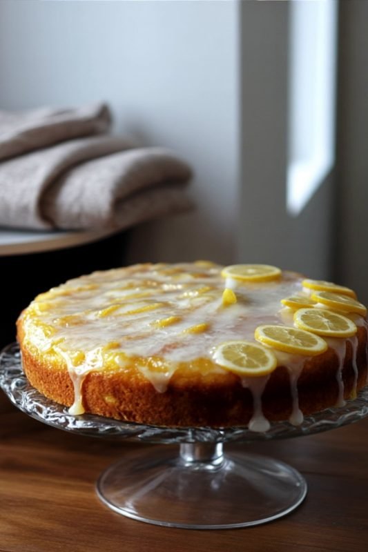 - For the glaze: Whisk the powdered sugar and lemon juice until thick but pourable. Transfer the cooled cake to a platter, optionally arrange the thin lemon slices on top, and drizzle with glaze. Let set 15–20 minutes before slicing.
