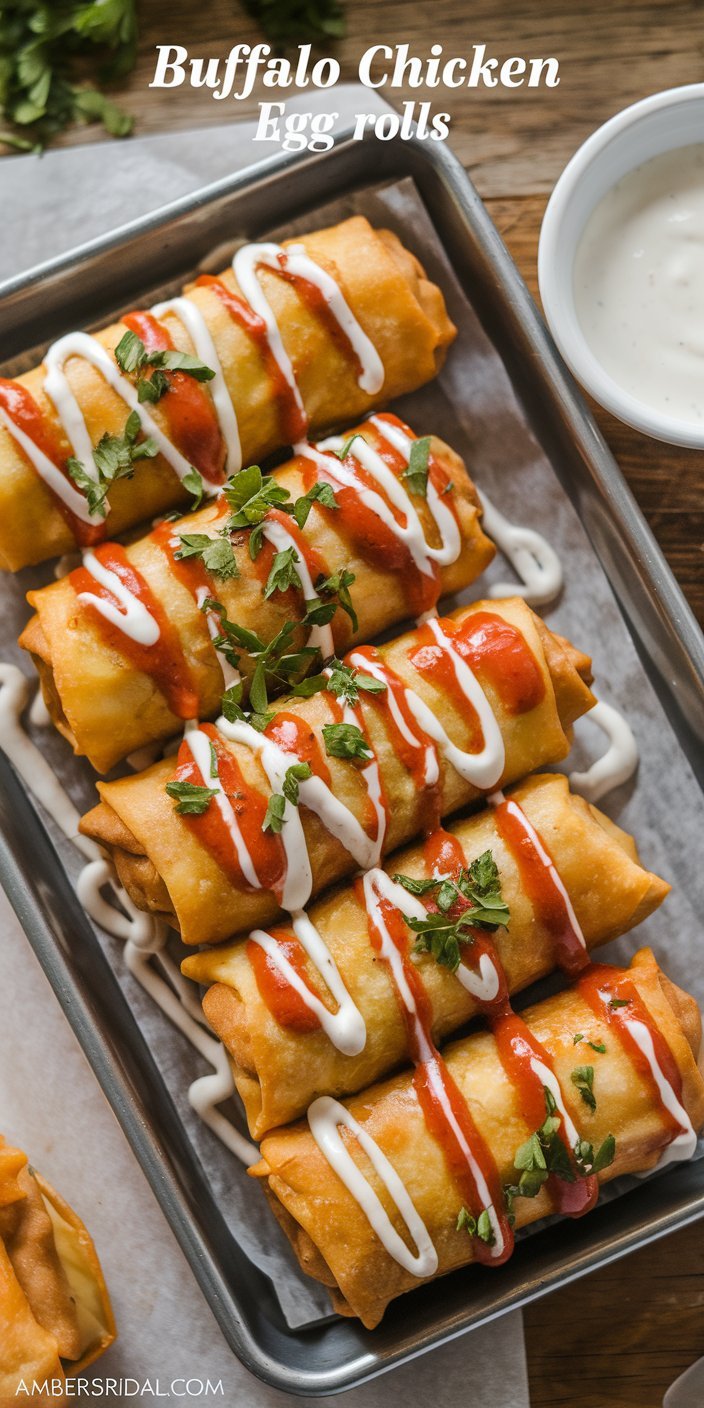 When serving buffalo chicken sides, place egg rolls on a stylish platter. Add small dipping sauce bowls. Top with chopped parsley or green onions for a fresh look and taste.