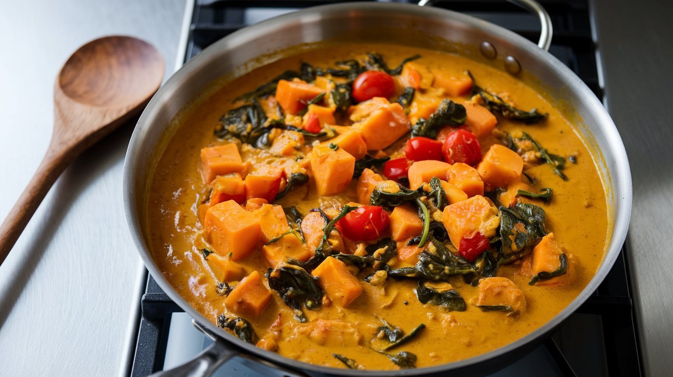Absolutely. Sauté the onions, garlic, and spices first, then transfer everything (including the butternut squash, tomatoes, and coconut milk) to your slow cooker. Cook on low for 4–6 hours or on high for 2–3 hours. Add the spinach at the end just before serving.