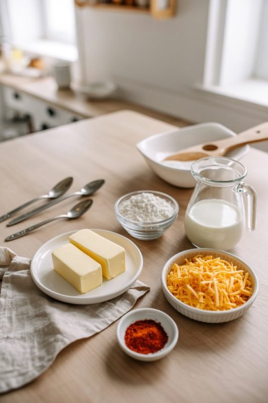 - Make the Creamy Cheese Sauce: In a small saucepan over medium, melt butter. Whisk in flour; cook 1 minute to form a pale roux. Slowly whisk in milk; cook 4–5 minutes, whisking, until it lightly coats the back of a spoon. Reduce heat to low. Stir in shredded cheese and paprika until just melted and silky. Season with a pinch of salt. Do not boil after adding cheese.