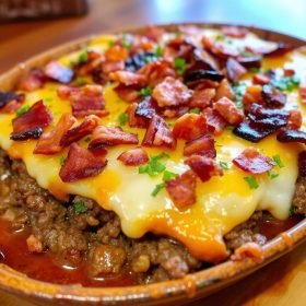 Top it with a lot of shredded cheddar cheese. Bake at 350°F for 20-30 minutes. The cheese should melt and bubble.