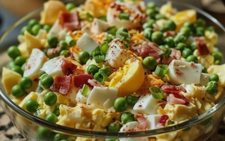 - Step 4: Combine Everything – In a large bowl, add peas, chopped eggs, bacon or ham, green onions, and cheese. Pour in dressing and gently fold to coat without mashing peas.