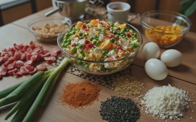 - Step 1: Prep the Core Ingredients – Thaw the frozen peas in a colander under cold water. Hard-boil, cool, and chop the eggs. Cook bacon until crisp and crumble, or chop ham if using. Reserve some bacon and cheese for garnish.