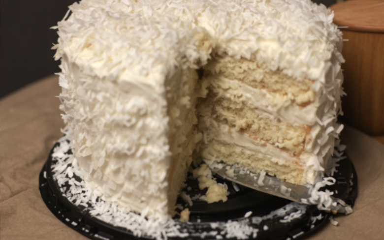 - Press coconut flakes onto the frosting immediately to finish the cake.