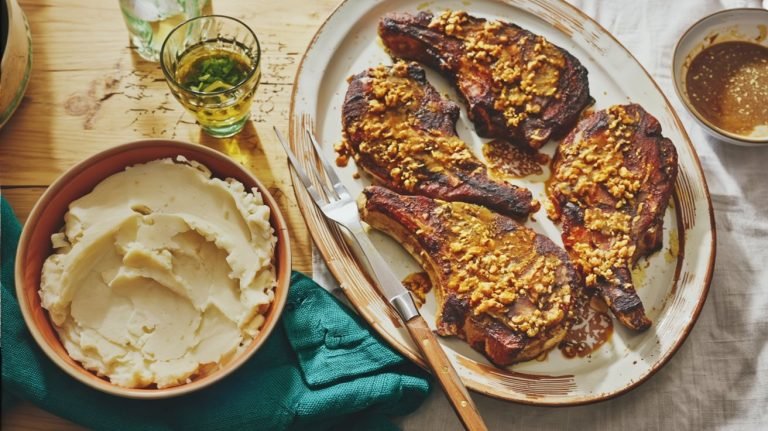 If you’ve ever wondered how steakhouses get that deep crust and juicy center, Cowboy Pork Chops are your answer—sear hard, finish gently, then smother in a glossy bourbon-mustard pan sauce. These cowboy pork chops are thick-cut, bone-in rib chops seasoned with a bold chili-cumin rub, oven-finished to a perfect blush, and served over creamy mashed potatoes. The surprise? That tiny bit of molasses and apple cider vinegar turns the sauce into a sweet-tangy glaze that clings to every slice.