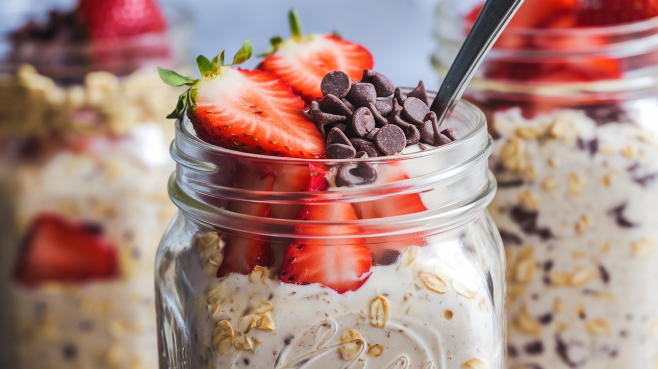 Remove the oats from the fridge and give them a quick stir. Top with the diced strawberries and, if desired, a sprinkle of mini chocolate chips for an extra treat. Enjoy this delicious, ready-to-eat meal straight from the container or in a bowl!