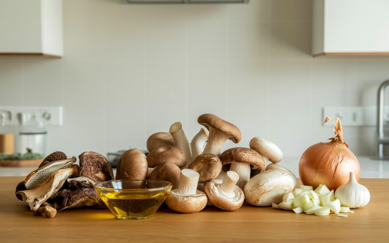 - Cook Mushrooms: Add vegan butter, then fresh mushrooms and sliced porcini (if using). Cook ~5 minutes until softened and lightly browned; season with salt and pepper at the end.