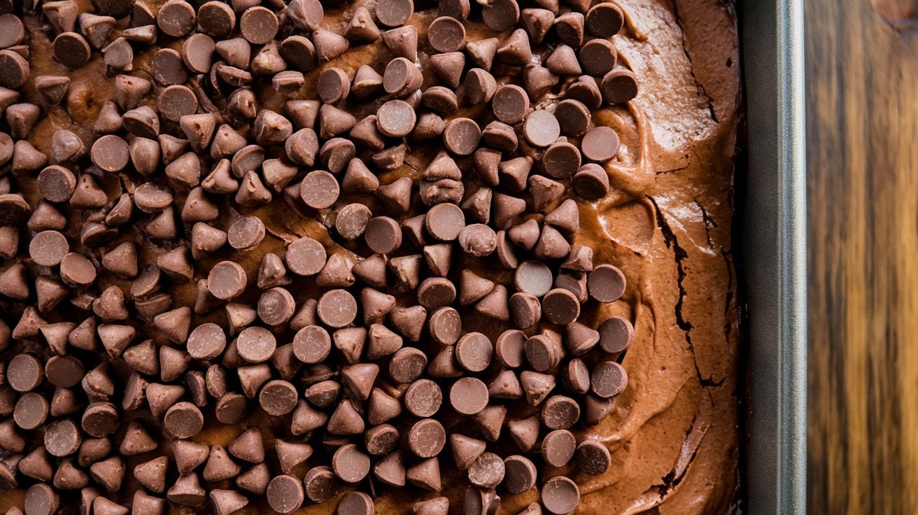 Pour the batter into your prepared pan and smooth it out evenly. Then, generously sprinkle the chocolate chips across the entire surface. These will melt into the top as the cake bakes, creating a luscious chocolate layer.