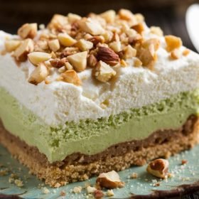 Once the pudding has set, whip the heavy cream and powdered sugar until stiff peaks form (or use pre-made whipped cream). Spread this whipped topping over the pudding layer. Refrigerate for a few hours or, ideally, overnight to allow the dessert to fully set.