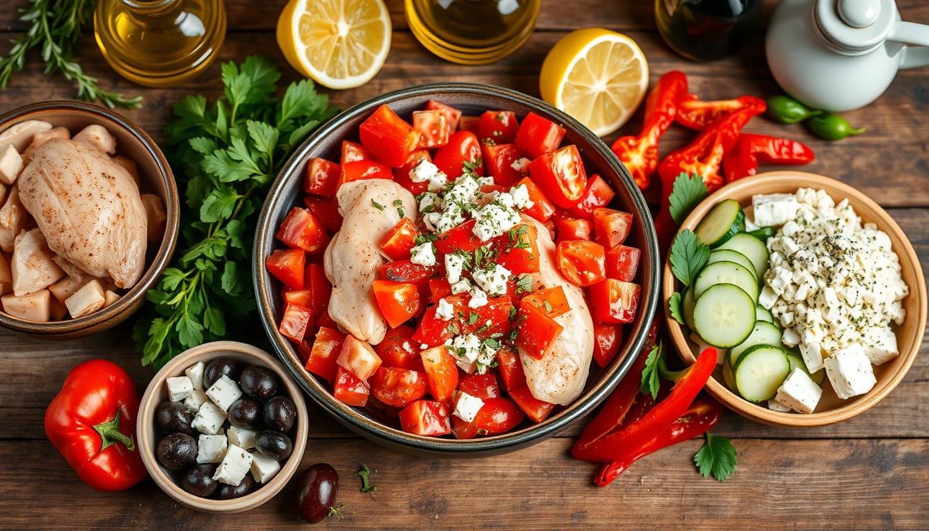 Adding Mediterranean ingredients to Greek Chicken Bowls brings many health perks. This diet is all about fresh veggies, lean meats, and good fats. It’s designed to make you feel great.