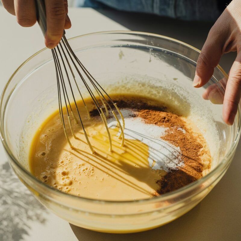 Whisk in the maple syrup, vanilla extract, milk, and melted butter until the mixture is fully blended.