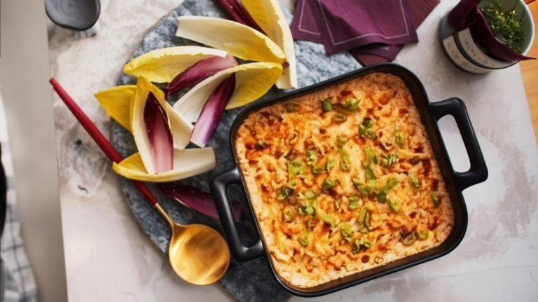You’ll love this hot cheesy crab dip—creamy, tangy, and loaded with jumbo lump crab for luxurious bites in every scoop. A blend of extra-sharp cheddar and havarti melts into a bubbly, golden crust while Worcestershire, hot sauce, and a splash of sherry vinegar add depth and brightness. Serve warm with crisp Belgian endive “boats” for an elegant, mess-free party appetizer that disappears fast.