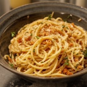 Spaghetti with toasted breadcrumbs (mollica) turns pantry staples into something elegant: glossy, garlicky strands crowned with audibly crisp crumbs. It’s quick, budget-friendly, and deceptively luxurious—an aglio-e-olio moment with texture. Cook it once and you’ll keep panko in your cupboard forever. Make it tonight and tell me if you’re Team Extra Crumbs or Team Extra Parm! Don’t forget to rate the recipe and subscribe for more simple, crave-worthy pastas.