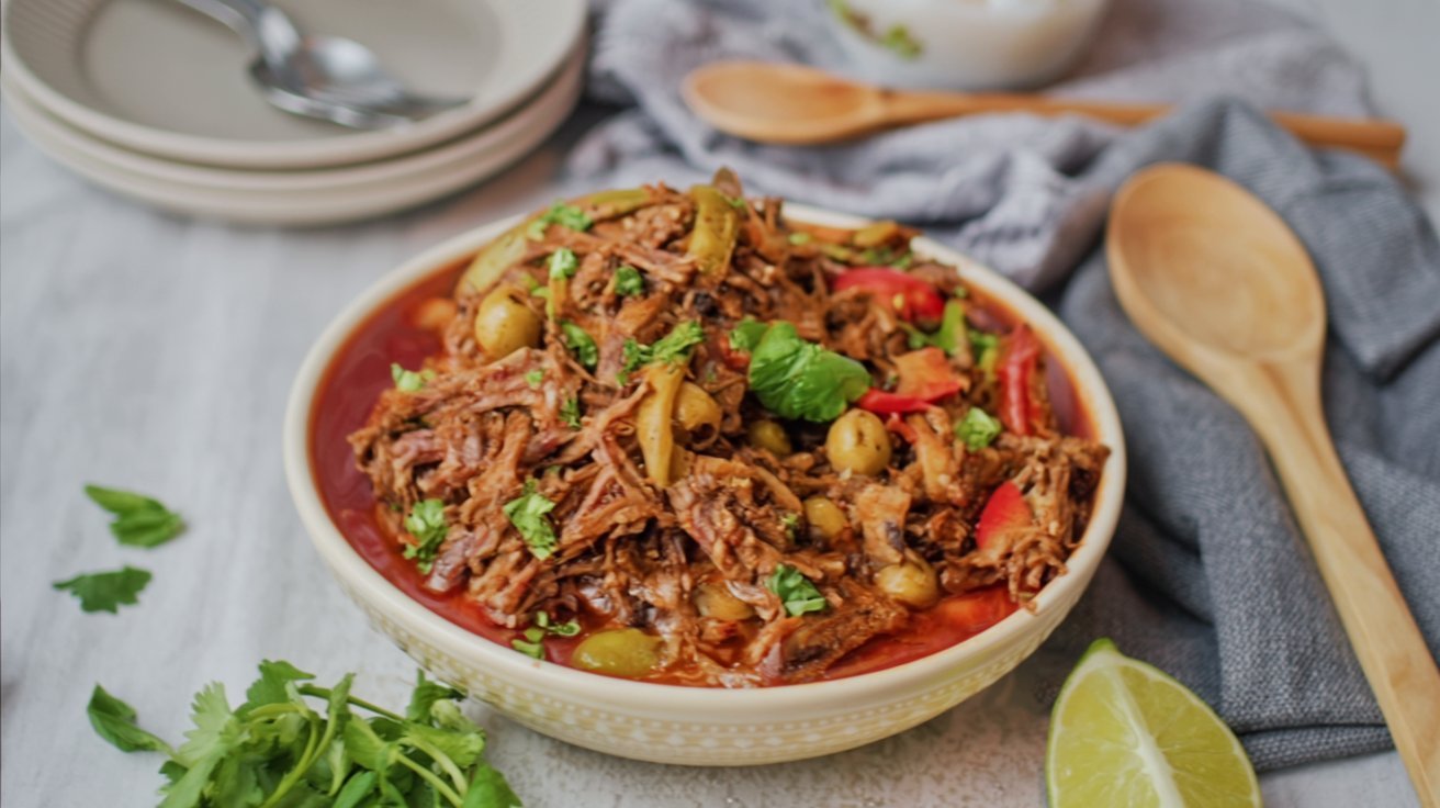 Melt-in-your-mouth Cuban-style shredded beef, pressure-cooked with peppers, olives, and a tangy tomato base. Big flavor, mostly hands-off, perfect over white rice.