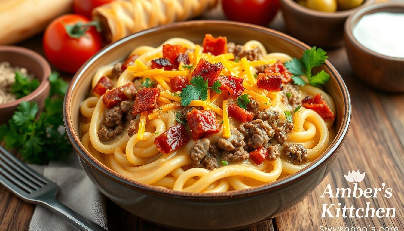 Imagine a dish that combines the juicy taste of a cheeseburger with the comfort of pasta. Our loaded bacon cheeseburger pasta does just that. It’s a meal that’s both familiar and new.