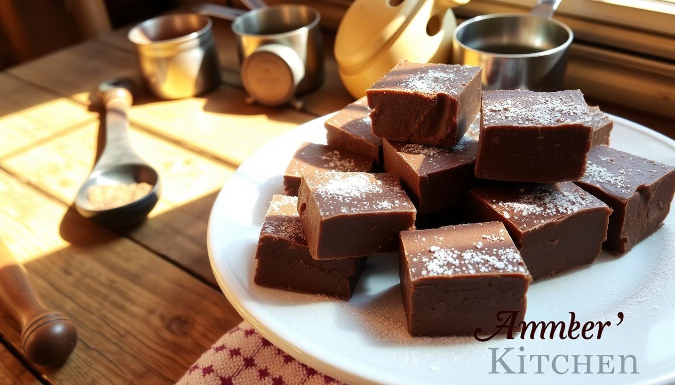 “Colorful display of traditional fudge in an artisanal confectionery shop, rustic wooden shelves, vintage glass jars filled with assorted fudge flavors, rich textures and glossy surfaces, warm lighting creating a nostalgic atmosphere, intricate details of homemade fudge being cut and arranged, inviting and charming ambiance, Amber’s Kitchen.”