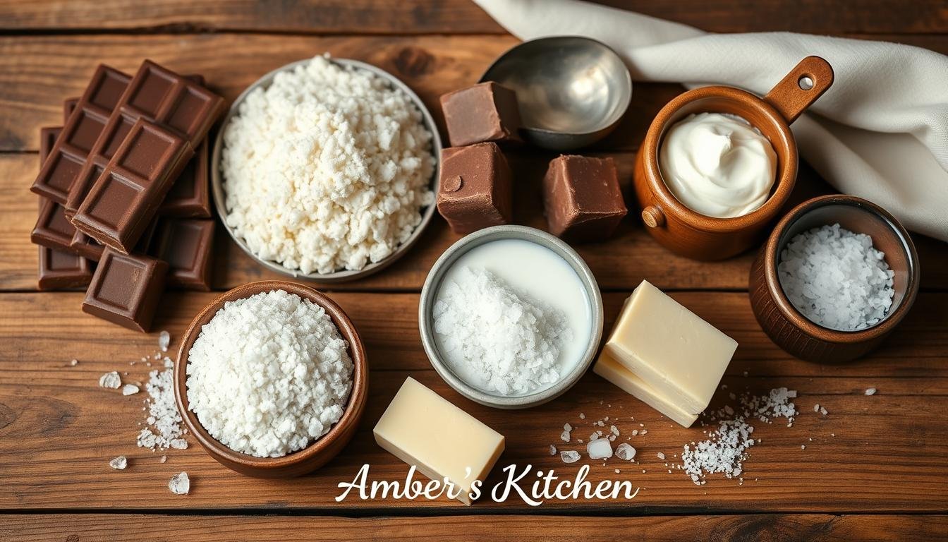 A beautifully arranged flat lay of essential ingredients for old fashioned fudge, featuring smooth chocolate, granulated sugar, creamy butter, rich heavy cream, and a sprinkle of sea salt, all on a rustic wooden background, with a touch of vintage kitchenware in the scene. Brand name “Amber’s Kitchen” subtly incorporated into the design.