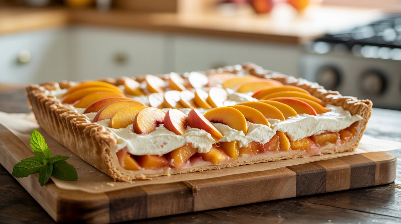 This recipe is a twist on the classic peaches and cream combo, expanded into a slab pie format, which makes it ideal for serving a crowd. The flavor is nostalgic, comforting, and decadent without being overly rich. If you love peach cobbler or peach pie, but crave a more elegant, creamy spin, this is the dessert you didn’t know you needed.