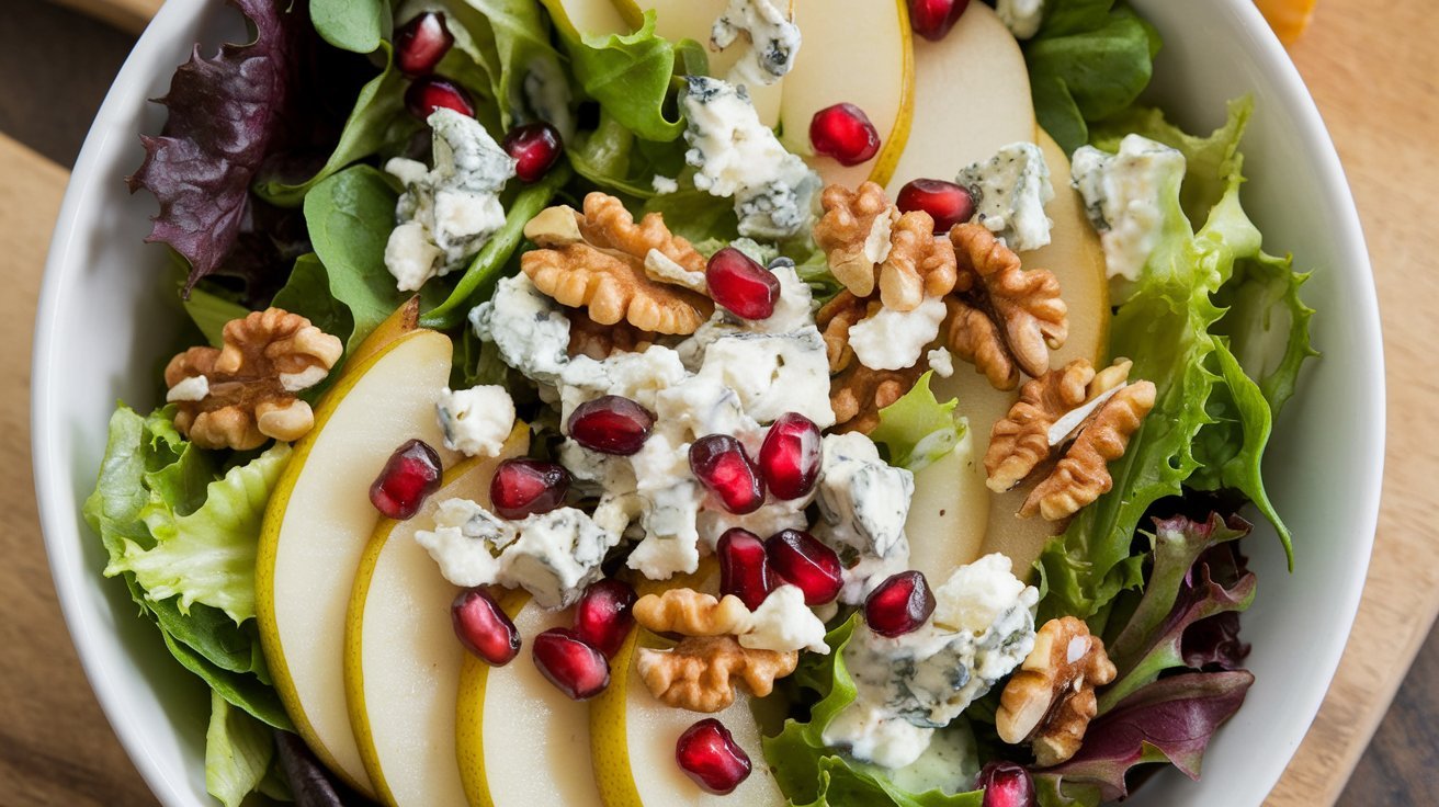 With its combination of fresh greens, juicy pears, crunchy walnuts, and tangy blue cheese, this salad is a well-balanced dish that suits a variety of occasions.