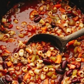 Plant-Based Version: Omit the beef entirely and use vegetable broth instead of beef broth for a vegetarian pasta fagioli. Add an extra can of beans or diced mushrooms for additional protein and umami flavor.