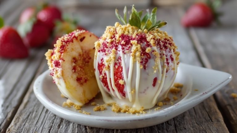 These strawberry shortcake candy apples turn a simple fruit into a bakery-worthy showpiece—crisp apple, creamy vanilla shell, berry-bright crumbs, and that nostalgic shortcake crunch. They’re quick to assemble, beginner-friendly, and endlessly customizable for any celebration. If you try them, leave a rating and a comment with your crumb combos or drizzle ideas—and subscribe for more eye-catching, no-bake desserts your guests will devour.