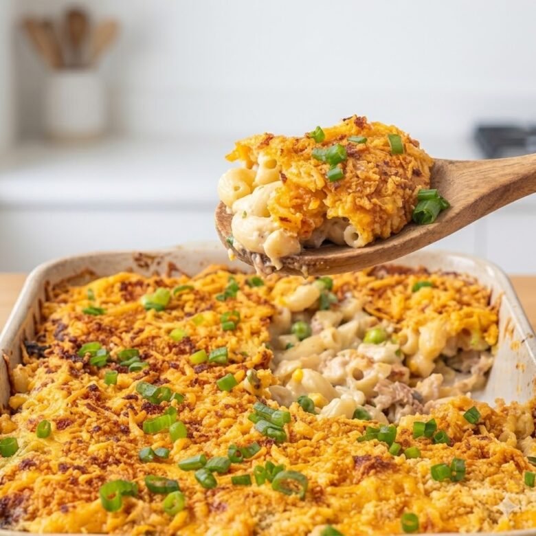 Pour the mixture into your prepared baking dish, spreading it out in an even layer. Sprinkle the remaining 1/2 cup of cheddar cheese evenly across the top, followed by the crushed potato chips or bread crumbs. Bake uncovered for 20 to 25 minutes, or until the edges are bubbling and the topping is golden brown. Let it rest for 5 minutes, garnish with chopped green onions, and serve hot!