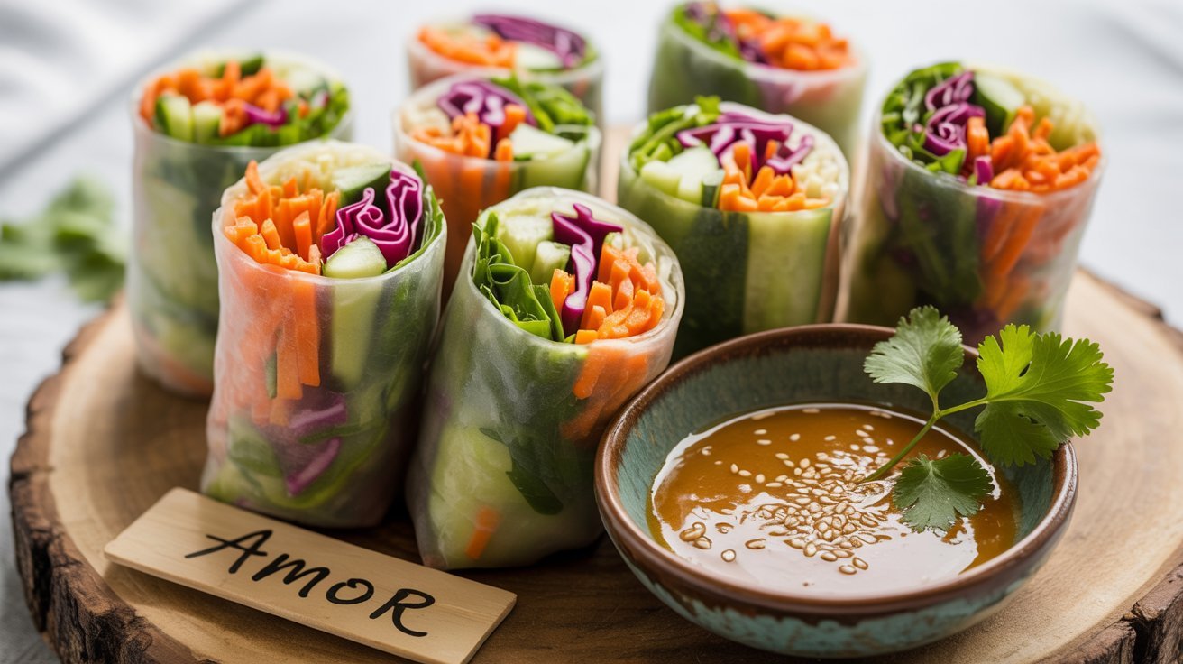 These spring rolls are a visual and textural masterpiece, combining tender rice paper with crisp vegetables, fragrant herbs, and chewy noodles—all dipped in a luscious, nutty sauce.
