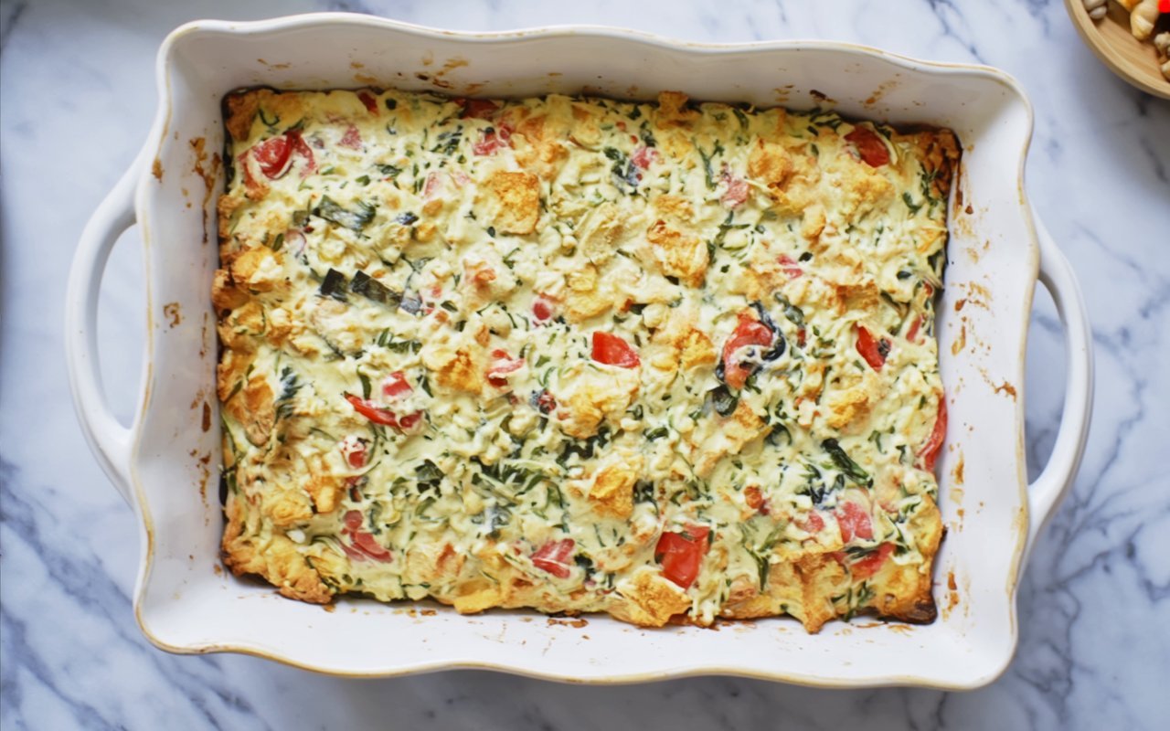 - Bake: Grease a 9×13-inch dish with olive oil. Spread mixture evenly. Bake 30 minutes at 350°F (175°C) until puffed and golden. If needed, increase to 425°F (220°C) for 5–10 minutes to brown.