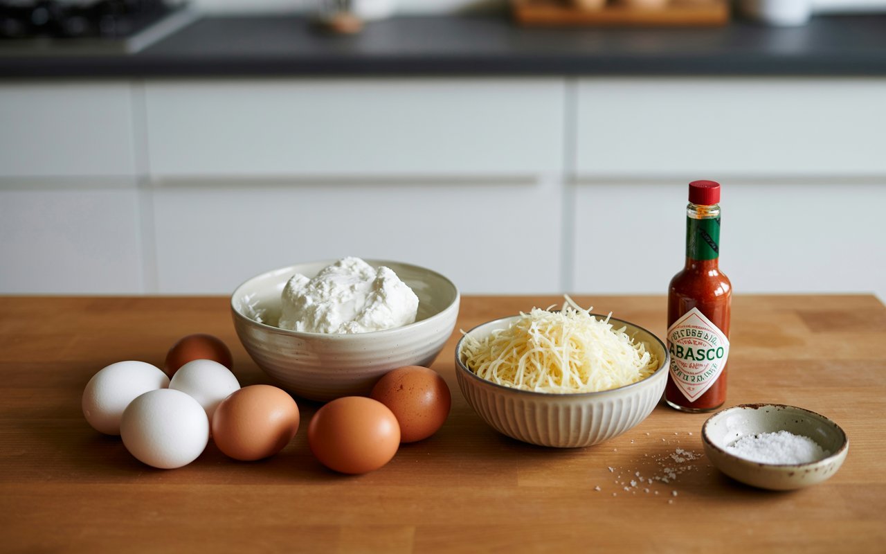 - Make Egg Base: In a large bowl, whisk eggs until smooth. Beat in ricotta until silky; stir in Parmesan, hot sauce, salt, and pepper.